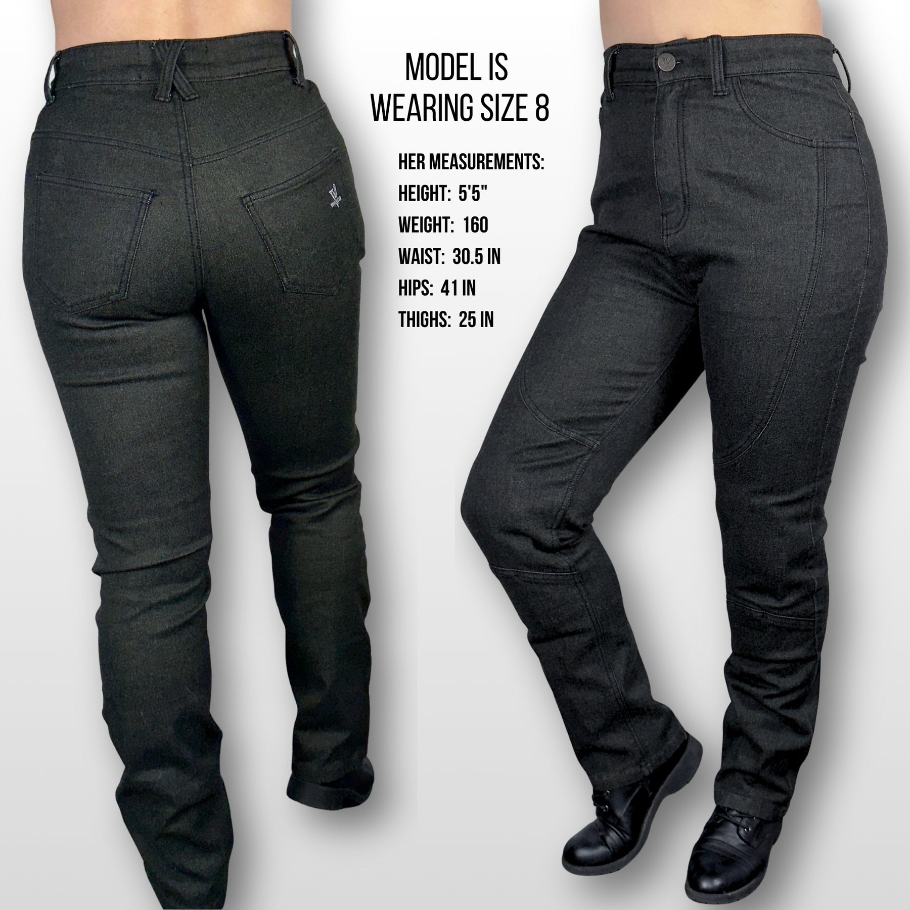 Julie wearing size 8 Black La Capa Motorcycle Denim Riding Jeans