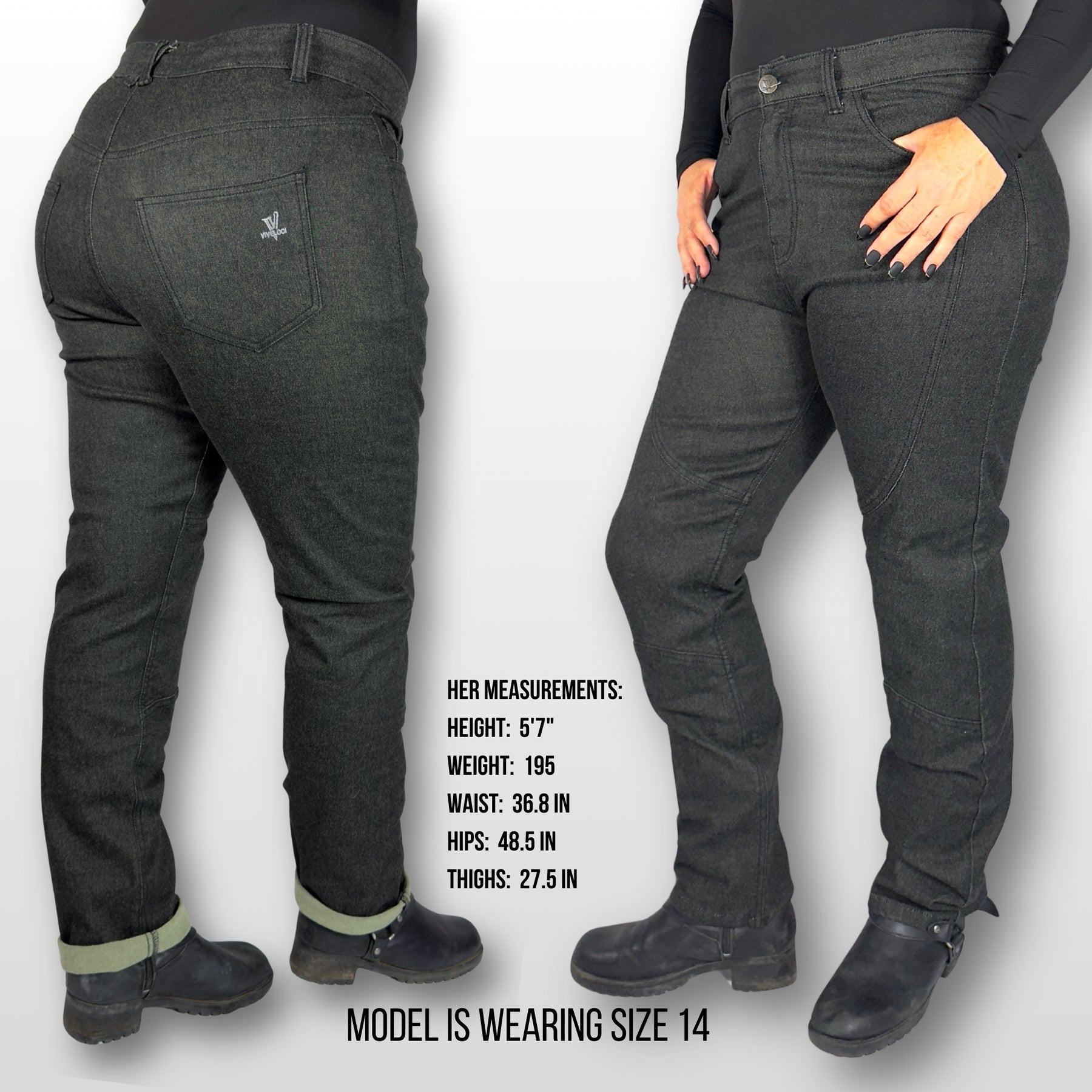 Deanna wearing size 10 Black La Capa Motorcycle Denim Riding Jeans